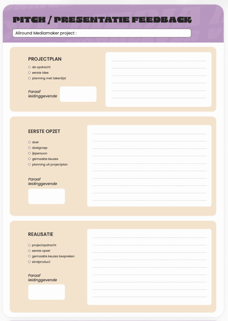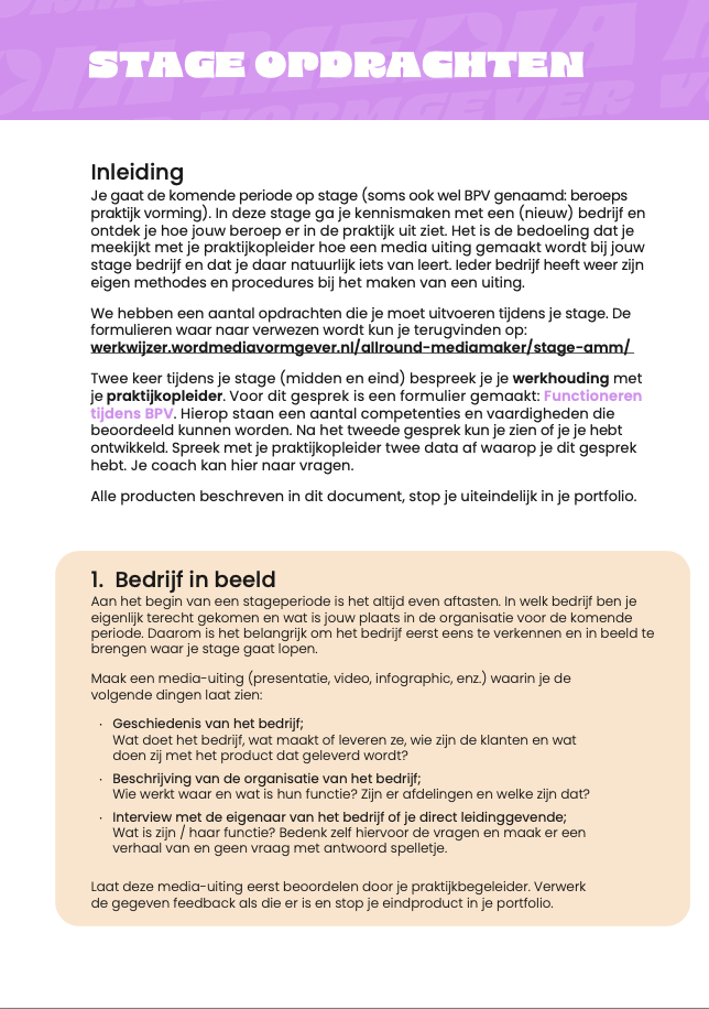 Hier vind je een overzicht van alle formulieren en bestanden die speciaal voor Allround Mediamaker (niveau 3) ontwikkeld zijn. Formulieren Portfoliochecklist Level AMM Pitch Presentatie Formulier AMM Stage opdrachten en formulieren Stage opdrachten Functioneren tijdens stage